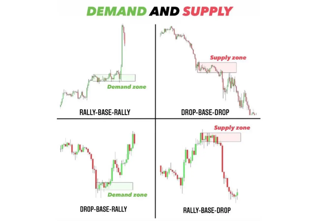 Supply and demand zones are specific areas on a price chart where there is a significant imbalance between buyers and sellers. These zones indicate where the market has previously reacted strongly, either through a rally (demand) or a decline (supply). The types of supply and demand can be broadly categorized based on their formation and market context.